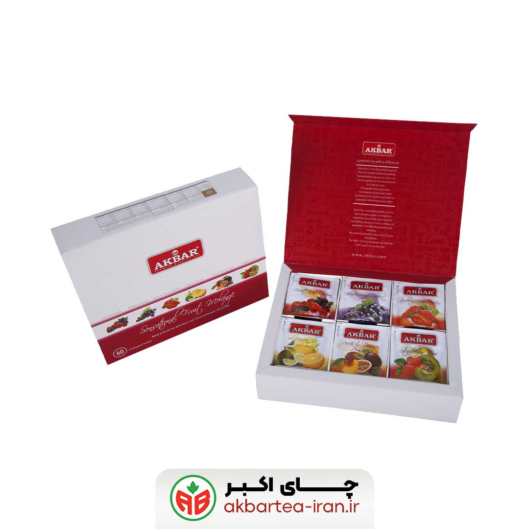 پک 6 طعمی اکبر، شامل 6 نوع چای میوهای شامل: چای توتهای جنگلی، انگور سیاه، توتفرنگی ، لیمو، میوههای استوایی و توتفرنگی کیوی میباشد. از هر طعم به تعداد 10 عدد در این پک تهیه شده است؛ یعنی این پک حاوی 60 چای کیسهای است.